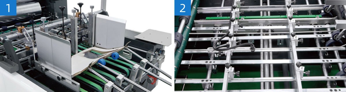 Utilizing independent servo drive, a single high-hardness stainless steel glue hose roller transfers glue, allowing for adjustment of glue thickness according to product requirements. Flexible stencil printing is employed, and the roller on which the stencil is installed is engraved with reference lines. Photoelectric sensing is automatically activated. During the glue application process, the roller will automatically retract when there is no paper, and the front and rear positions of the glue can be digitally adjusted within the human-machine interface. Additionally, the left and right positions of the glue can be adjusted without stopping the machine. The glue roller can be pulled out in parallel for easy cleaning.